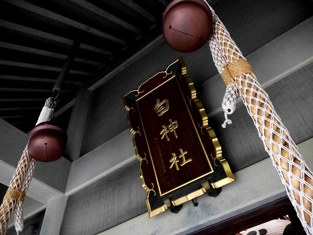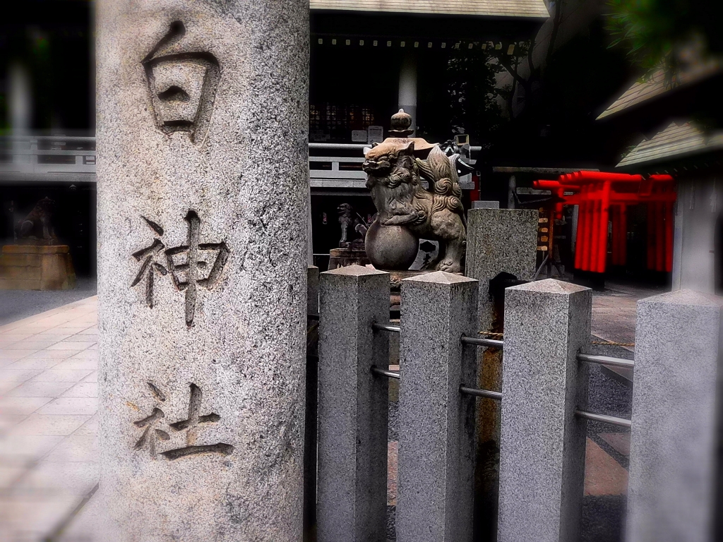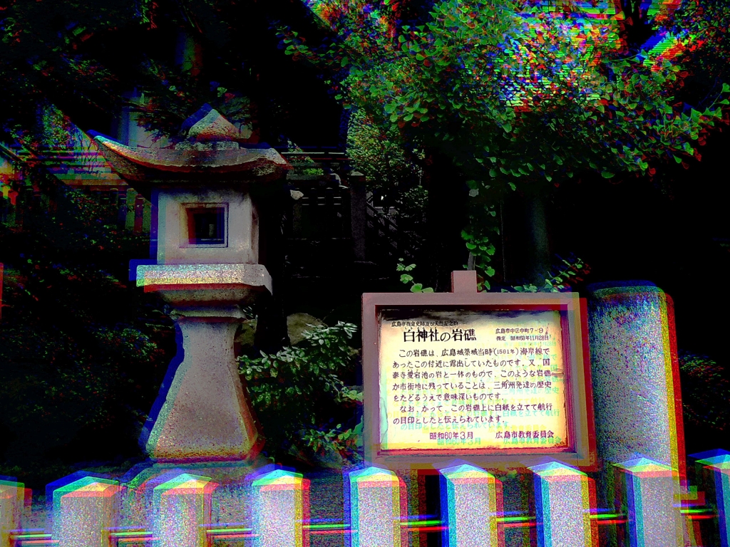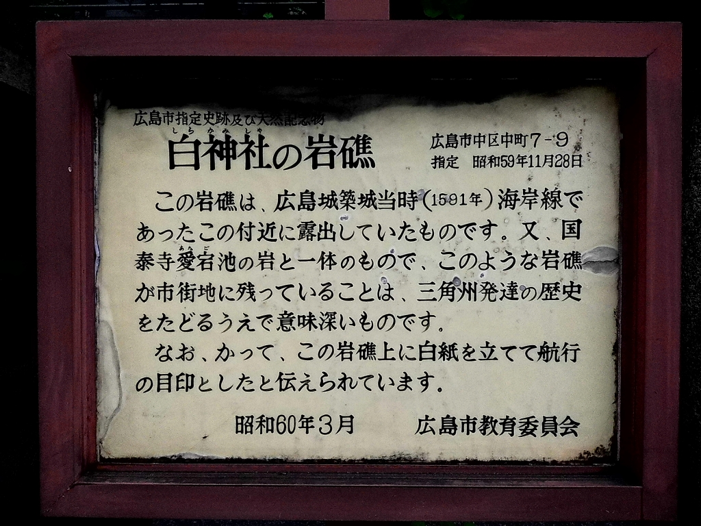 「白神社(しらかみしゃ)」は広島の中心地、中区中町の平和大通りと広島電鉄宇品線の交差点に面している。かつてこの一帯は海であり、白神社は海に面した岩礁の上に建造されていた。つまり、現在の広島市は5つの三角州から出来ているのだが、約600年前まではこの平和大通り以南は全て海であったことが分かっている。