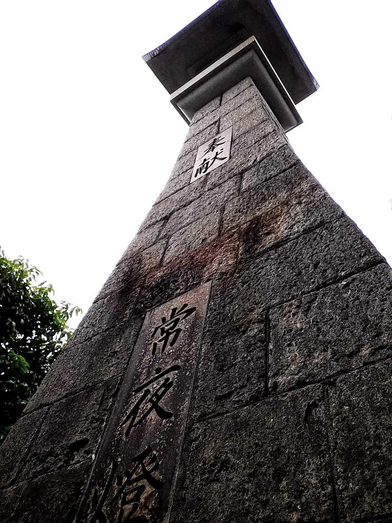常夜灯は高さ5~6mはありそうな巨大なものだが、最上部は原爆で吹き飛んでしまい、後に再建された「被爆常夜灯」である。丸でスカートをはいたように中央部から下の部分は被爆時の熱線で焼け焦げてしまい、赤茶っぽい色に変色している。