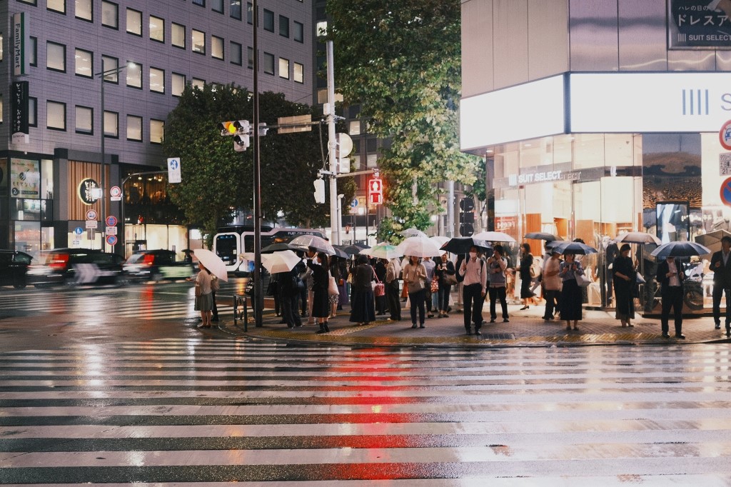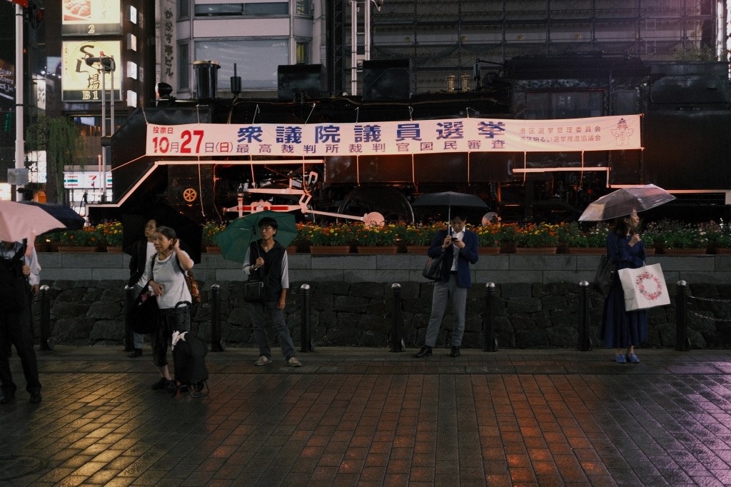 夕暮れ過ぎに小雨が降り出した新橋駅前。