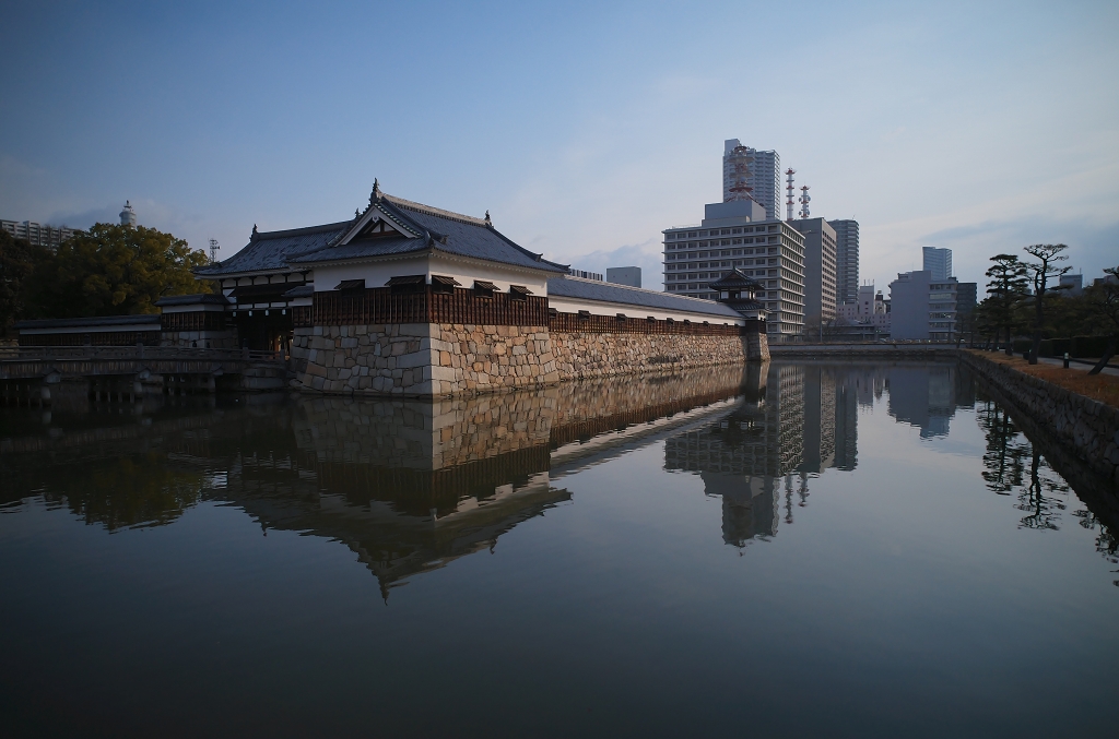 お堀に映った広島城の表御門~平櫓にも冬を感じる。