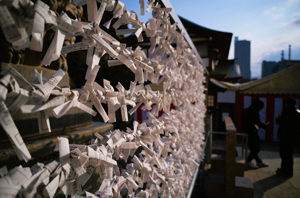 藁で巻かれたやぐらの土台部分には沢山の古いおみくじらしき白い紙も見える。
