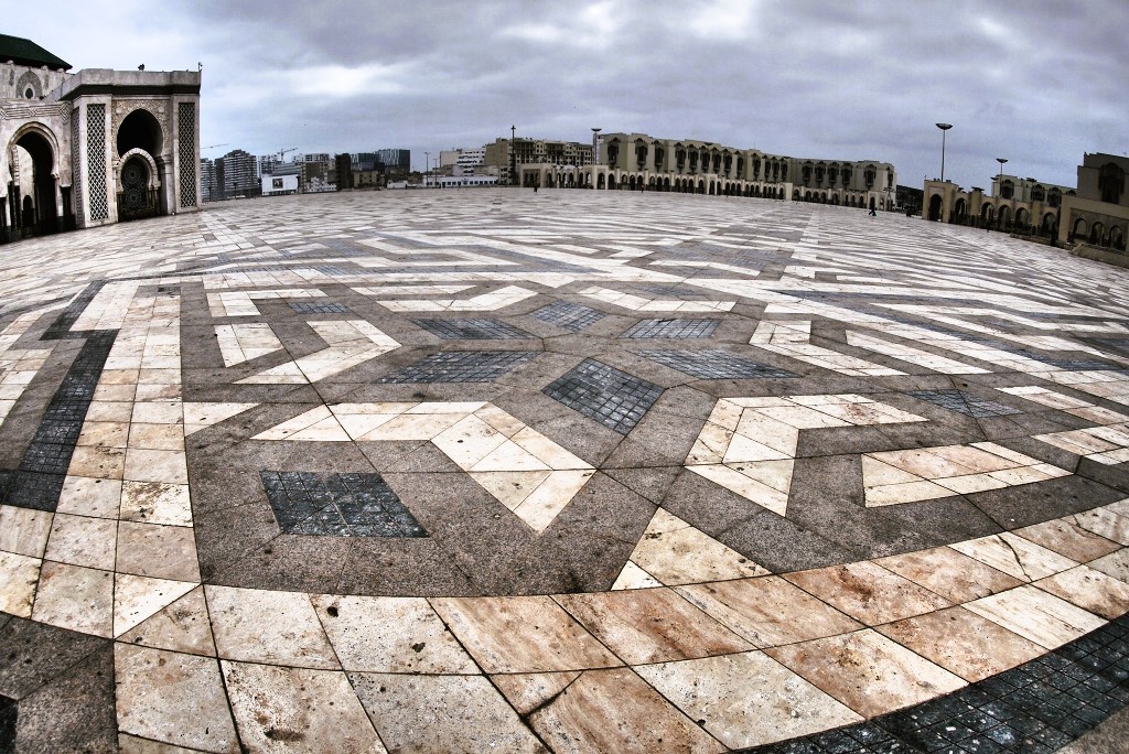 モスク前の広場には大理石や御影石で敷き詰められた幾何学的デザインが広がる。