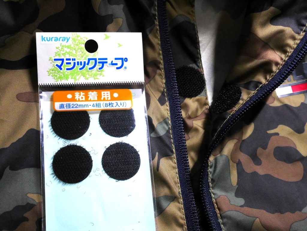 そんなこんなで長年モヤモヤとした気分で愛用して来たのだが、ユザワヤで偶然、便利なマジックテープを発見した。粘着式、アイロンによる熱圧着式など種類も豊富で、だまされた積りで「粘着式」を購入して早速2カ所に取り付けたところ、これが非常に便利でまあまあ使えそうとなる。