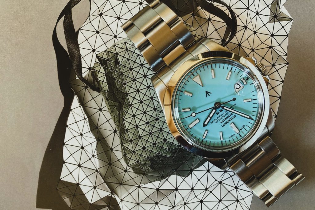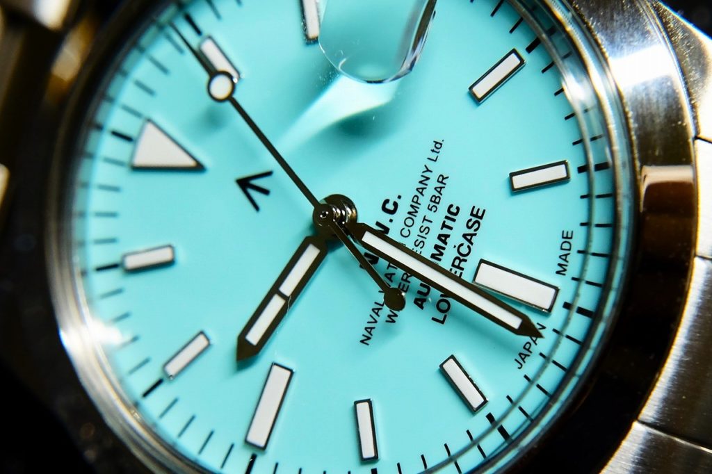 2021年に発売されたシチズン「TSUYOSA」シリーズでもスカイブルーの文字盤が大人気となったことも世界中で話題となる。更に直近ではぼくも愛用中のハミルトン・カーキ・メカニカルに、スイス・ツェルマット店(Zermatt boutique)のみで限定販売されるアルプスブルー文字盤も登場した。このモデルは久々に垂涎の一本であり、現物を是非見たいと思っているのだが、これからスイスまで出かけるのはちょっと面倒臭いので指をくわえているのみだ。そんなこんなで「Poolside」以来、ぼくの中で再燃してしまったこの色彩に迷いながら、ようやく全体バランスの観点から嗜好に合致したのが今回の「NAVAL WATCH by LOWERCASE」だ。