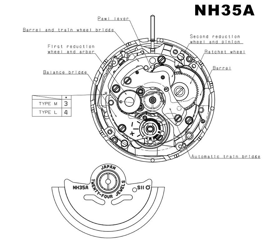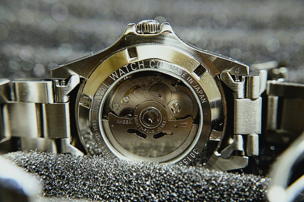 ケース径は39mmで許容範囲内。文字盤にはミリタリー支給品の証しである矢羽根マーク(ブロードアロー)が刻まれ、機能性と意味性が共存している。風防はドーム型のアクリルレンズを採用し、日付部分には視認性を高めるサイクロップレンズを搭載している点もツボを押さえている。LumiNova®蓄光塗料を採用したINDEX形状やラジオミール(PANERAI)と同じデザインのペンシル針も本格的だ。ムーブメントはCal.4R35とほぼ同等で信頼性の高い日本製(SII製)自動巻きCal.NH35Aを搭載し、凡庸ながらも41時間のパワーリザーブと5気圧の防水性能を備えている。地板やプレートはペルラージュやジュネーブストライプ等は望むべくもなく、そっけない筋目加工処理としていることはSEIK5などと同じだ。