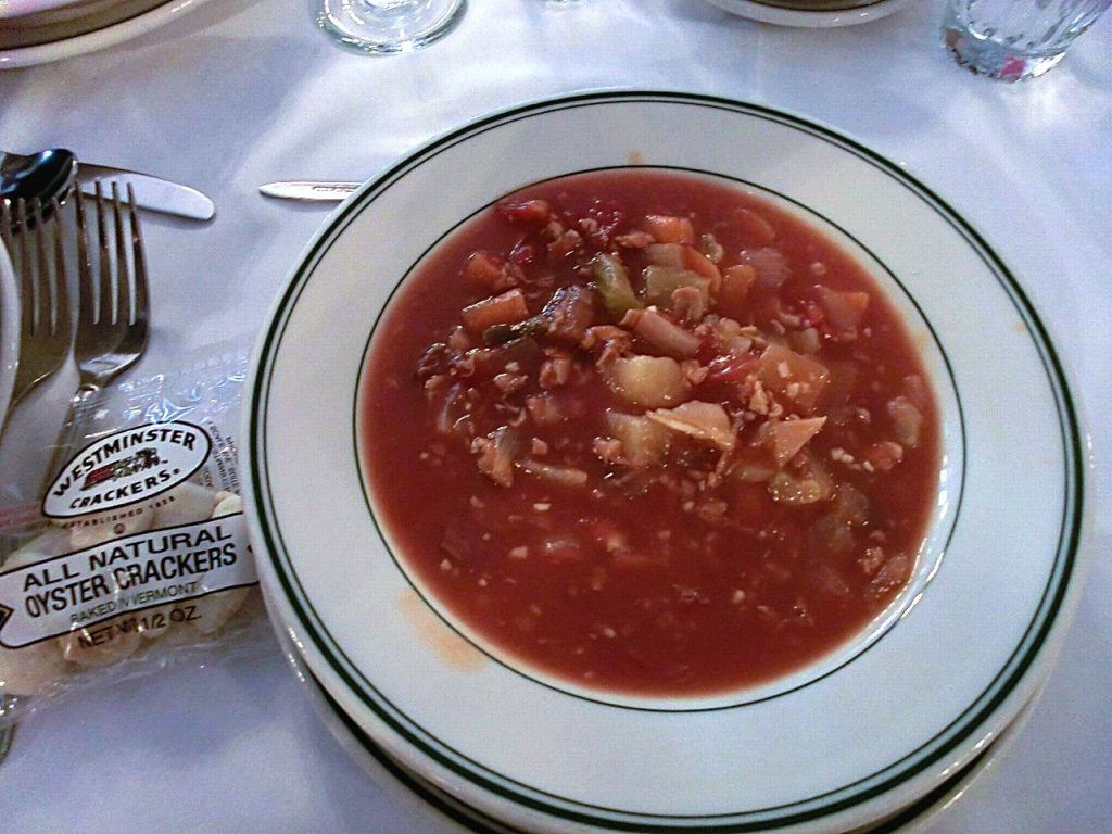 まずは前菜に、トマトベースの野菜スープをすくい、ひと口ごとに体が目覚めていく感覚を楽しむ。テーブルには海の香りそのままの巨大オイスターが運ばれ、レモンを絞れば潮風が一瞬で口いっぱいに広がる。日本の岩ガキよりもさらに一回り大きい感じで、アメリカらしく豪快だ。