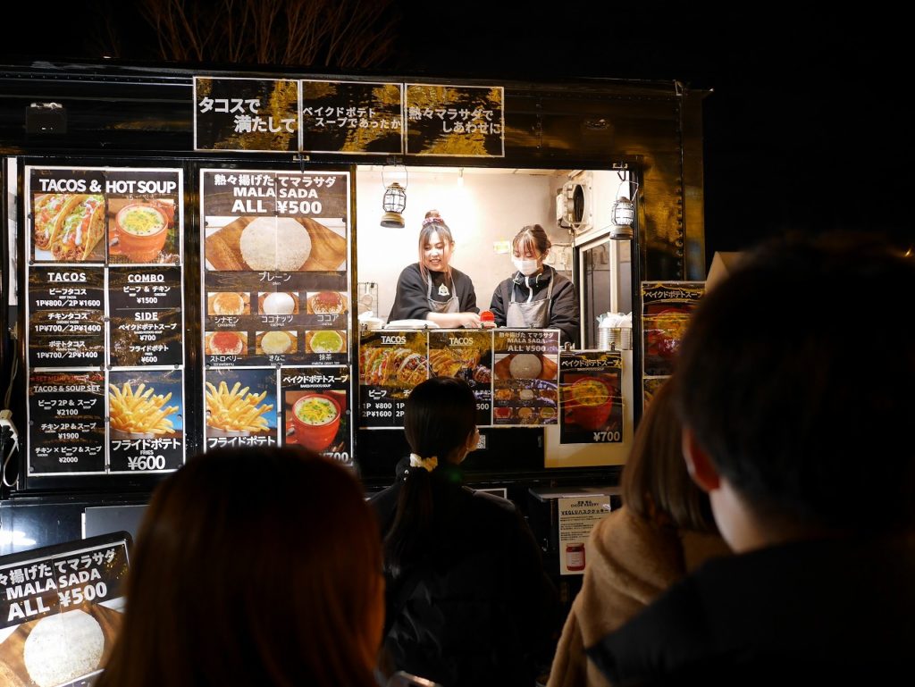露店の屋根に吊るされたランプやツリーのイルミネーションは、昼と夜の境界線を丁寧になぞるように灯っていた。