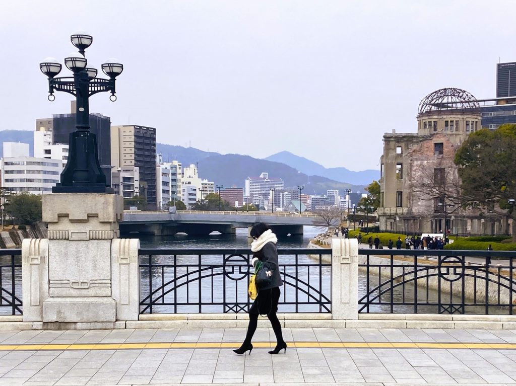 足音だけが一定のリズムを刻み、原爆ドームの輪郭が、低い雲と冷たい光の中で際立つ。