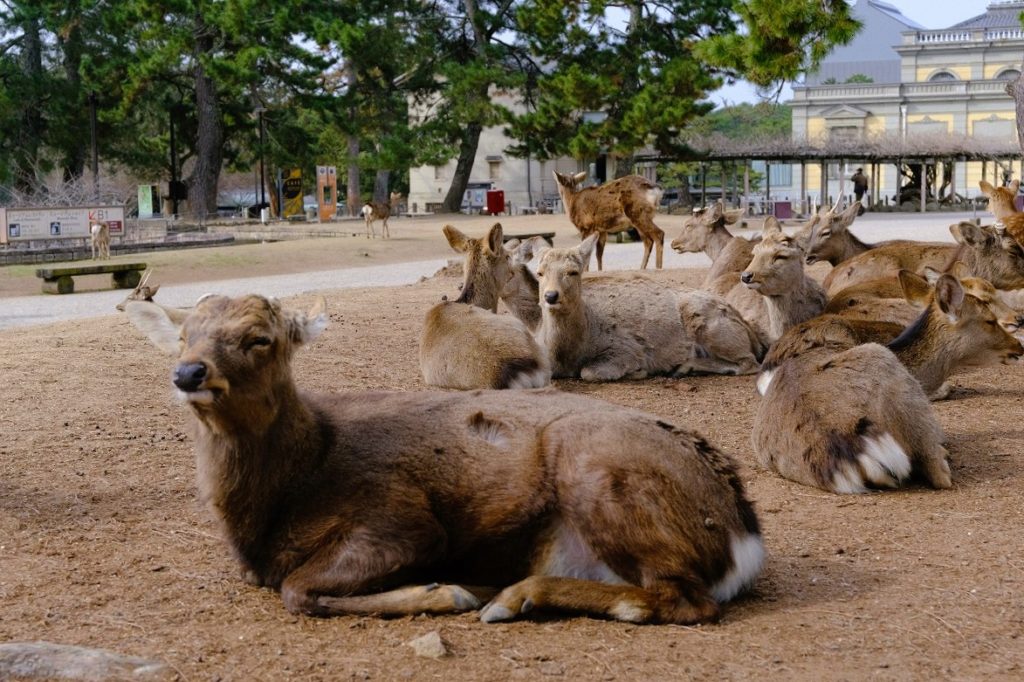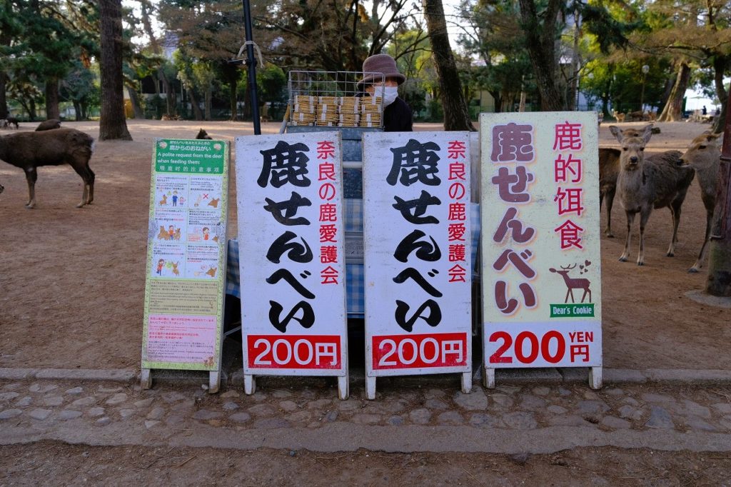 奈良公園の鹿は天然記念物に指定された野生のニホンジカ動物であり、現在約1,500頭が生息している。主食は芝生やドングリなどの自然植物であり、人間が与えることができるのは消化の良い米ぬかで作られた鹿せんべいのみ、がルールだ。