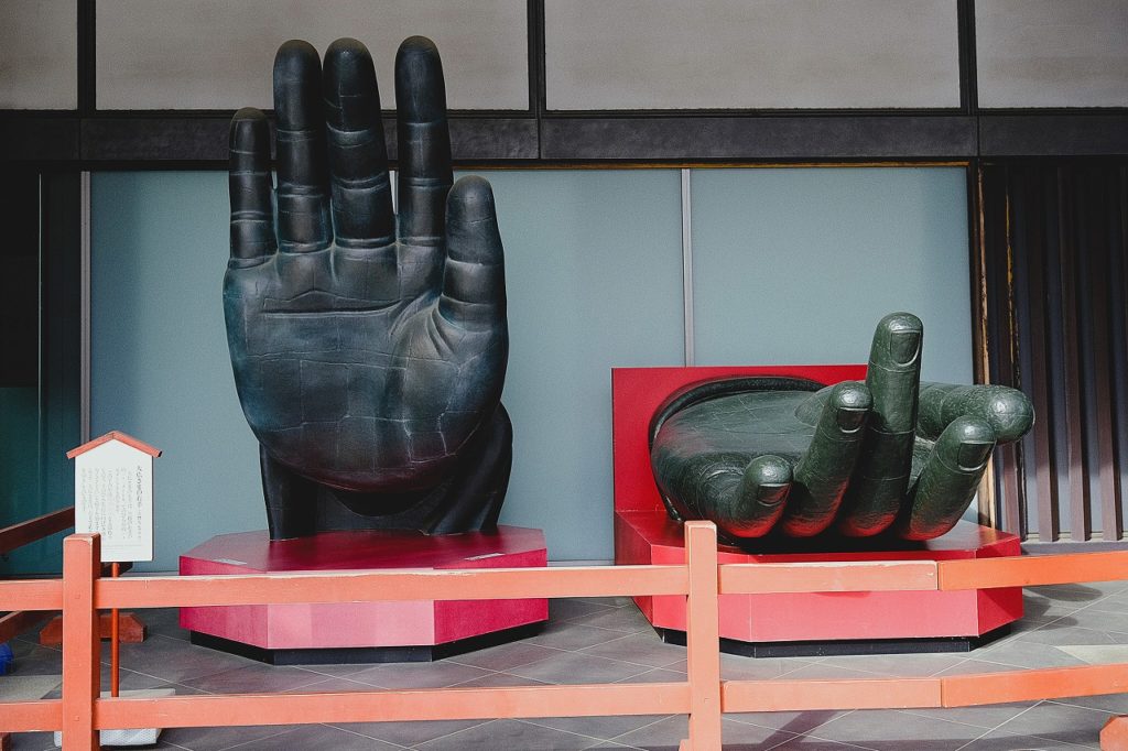 左手は与願印(よがんいん)と呼ばれる手のひらを上に向けて「願いをかなえる」サイン。